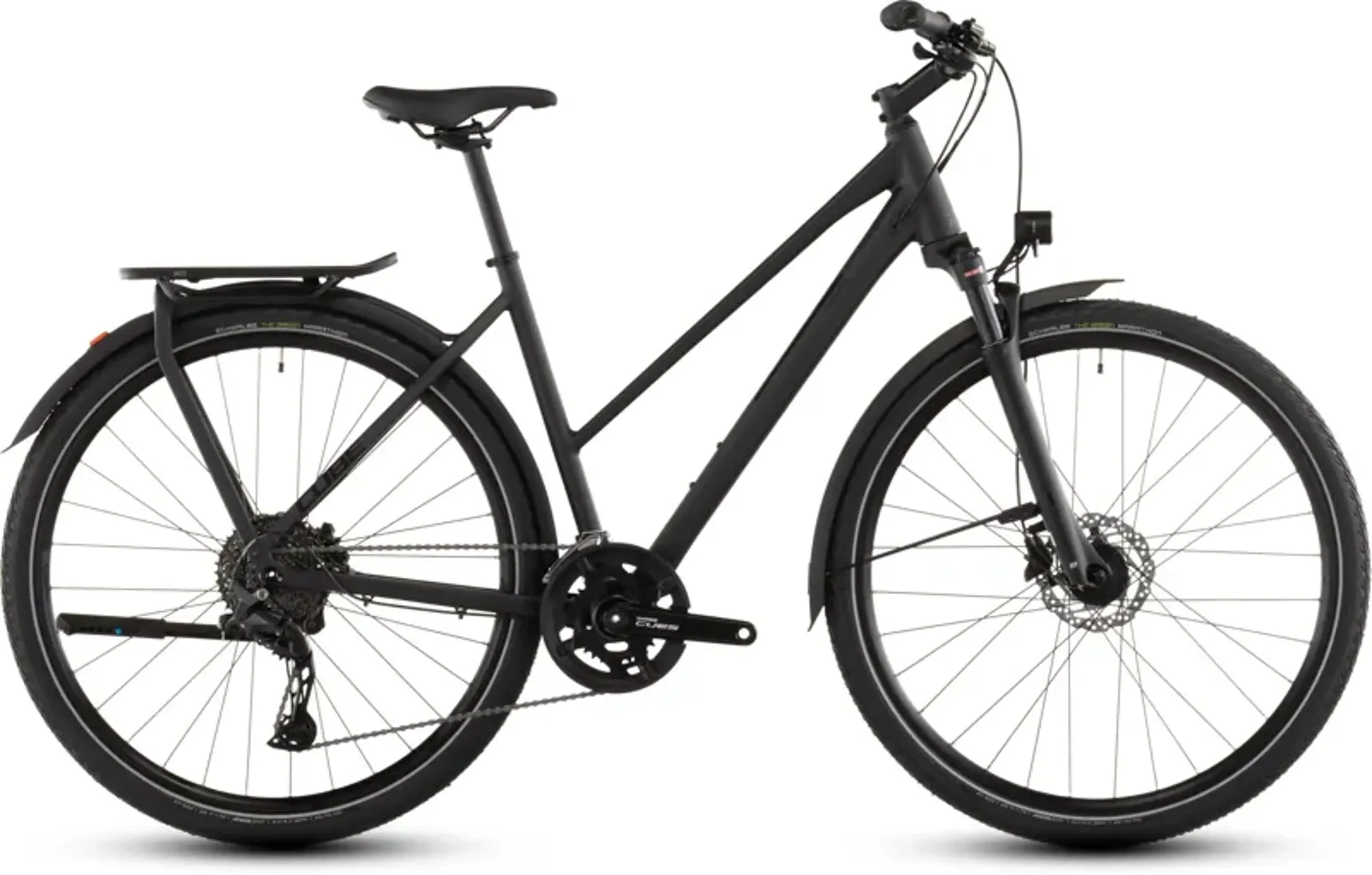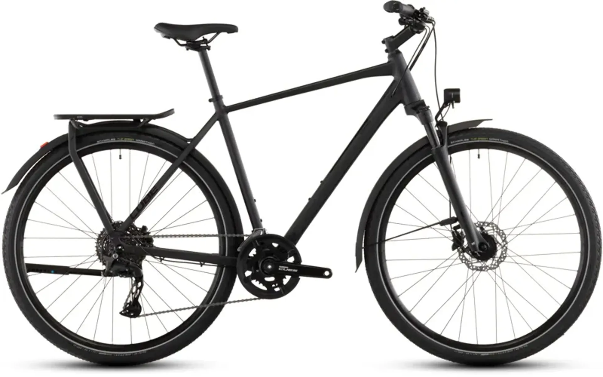 From the elegant simplicity of the Integrated Carrier 3.0 to the full-length mudguards, front and rear lights, and CUBE FM kickstand, it's the practical everyday companion that's rugged enough to take on longer trips, too. A Suntour air suspension fork makes even the roughest roads smoother, for a more comfortable ride. Schwalbe Green Marathon tyres use recycled rubber to reduce their environmental impact. Shimano's Cues 2x10 gears give you the range you need to make light work of any route. And Shimano hydraulic disc brakes ensure you can always stop safely, no matter what you're carrying or what the weather is throwing your way. Urban jungle or distant horizon, the Kathmandu Pro has your back.